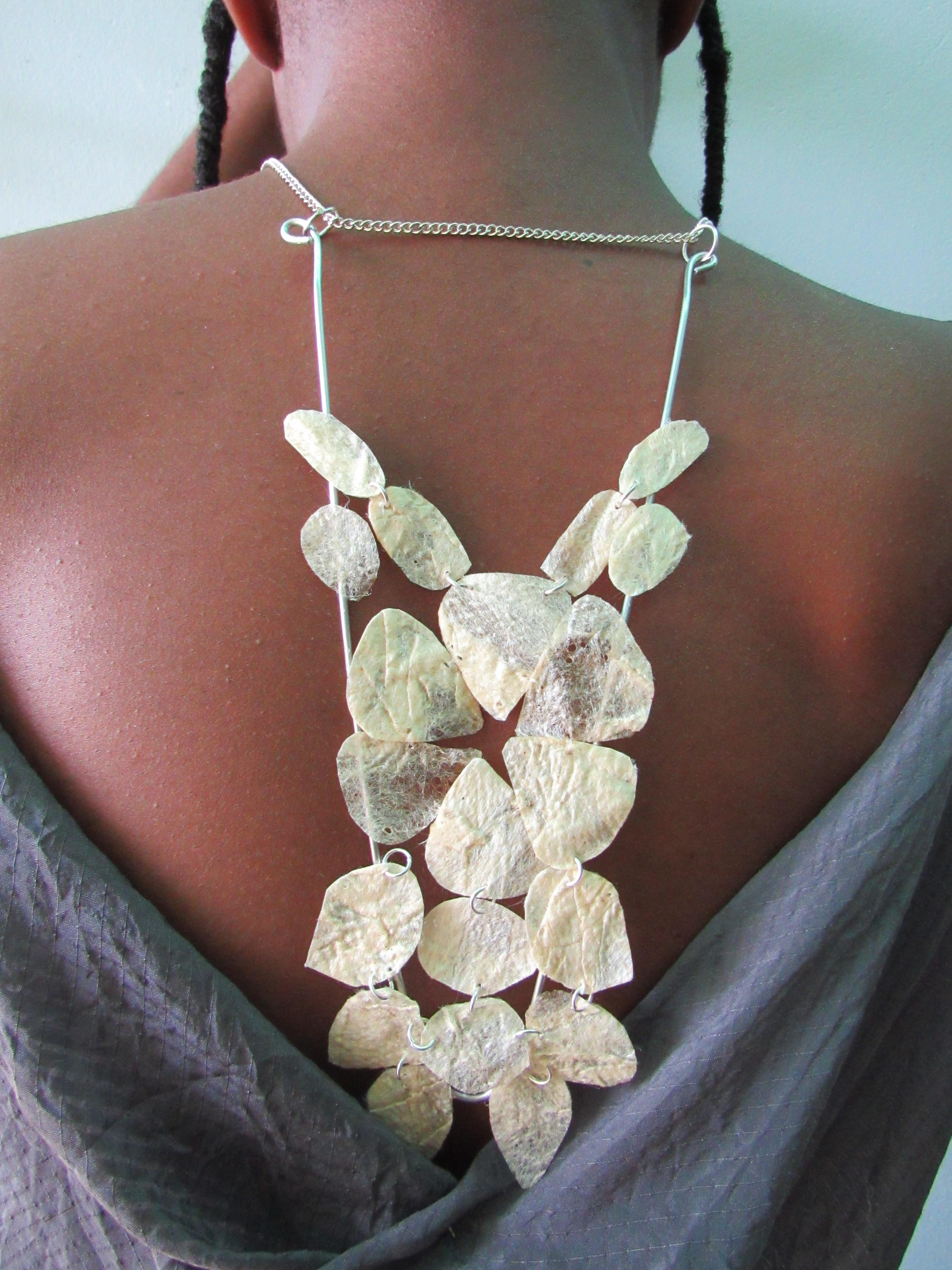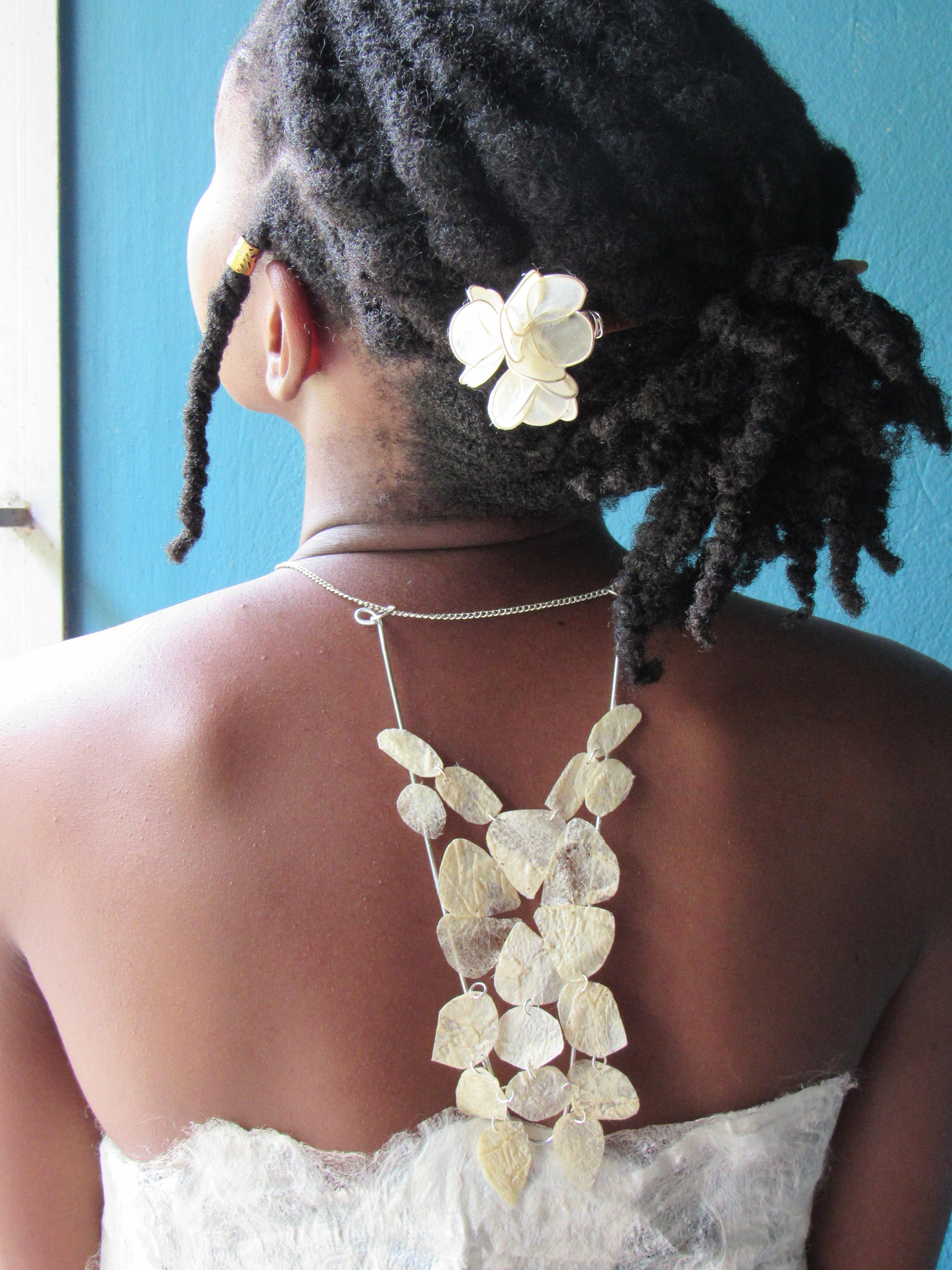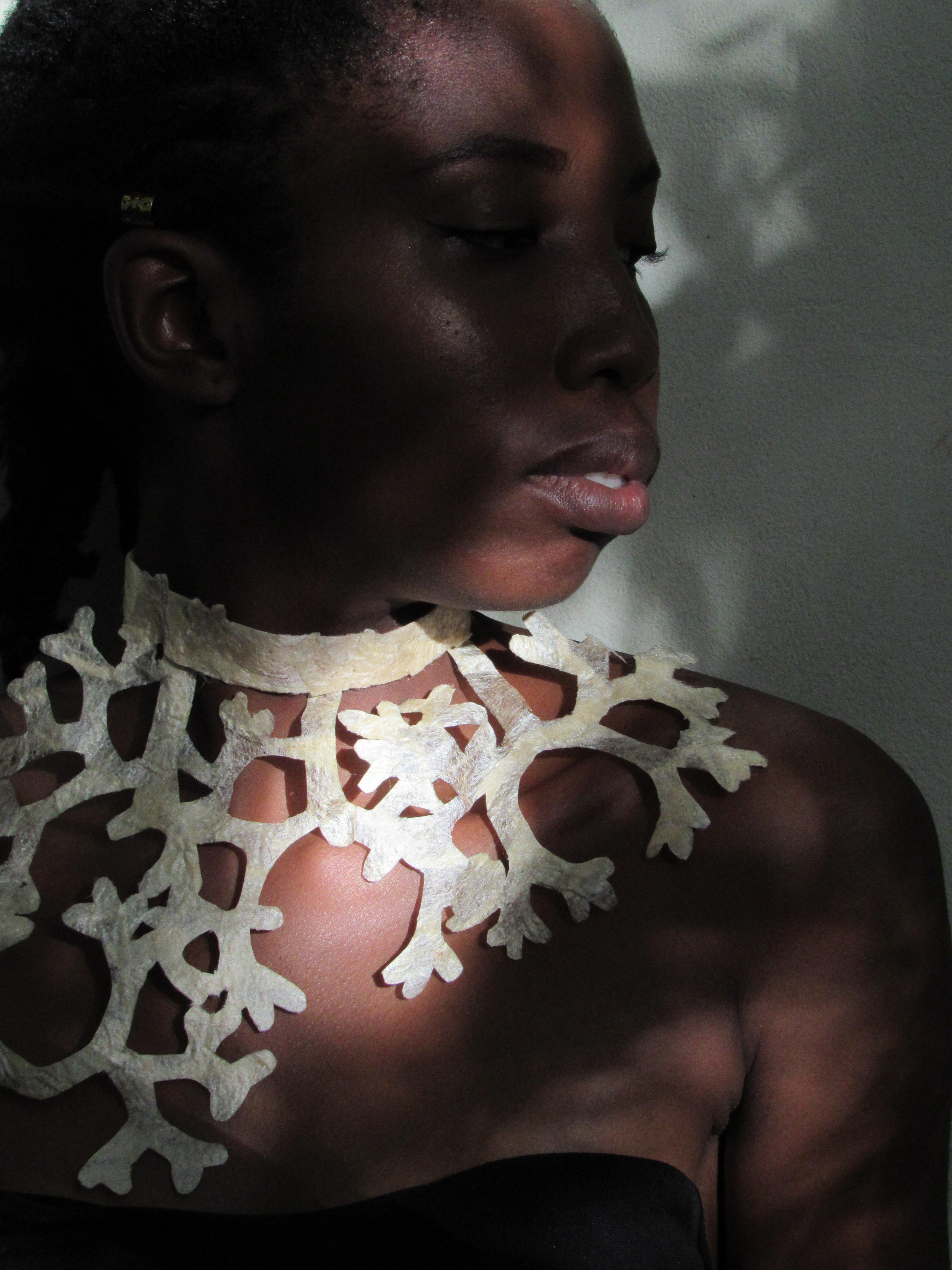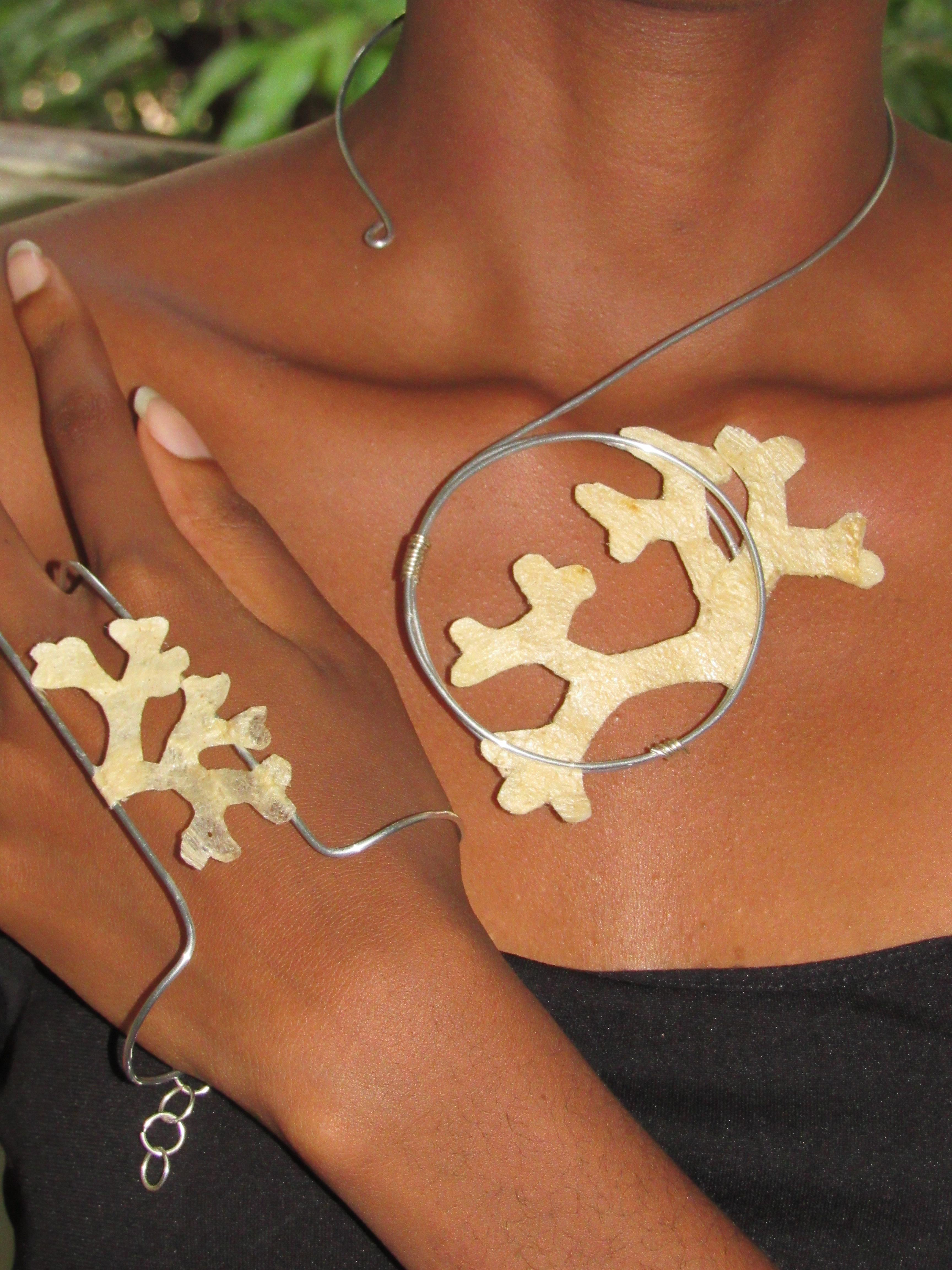 Created and crafted by designer, Leah Clarke, Teal is a line of low-environmental impact jewellery that uses recycled materials and fibres to create unique and innovative body embellishments. Inspired by Ernst Haeckel’s renderings of microorganisms, as well as the materials and processes of Trinidad’s traditional mas, this collection offers an array of unique pieces for the contemporary woman.
